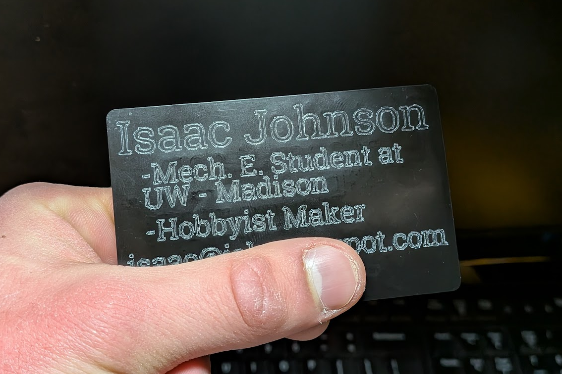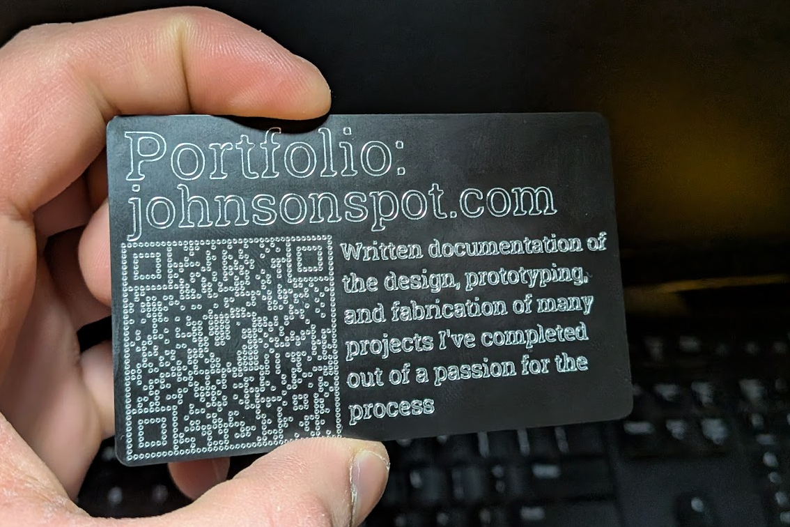 I initially wanted to try engrave both sides of the card, with one side being focused on personal information and the other on this portfolio. Unfortunately, the card blanks consistently etch really poorly on one side so I had to put everything on the other.
