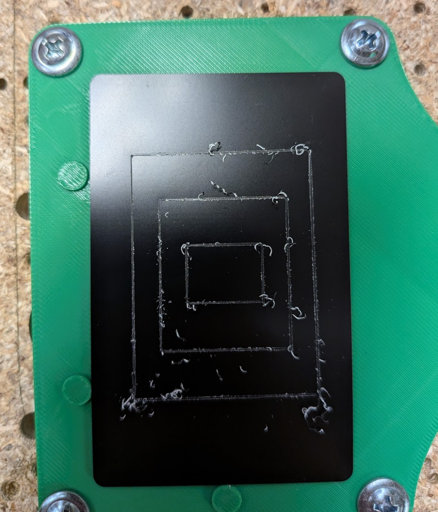 I was ready to try actually engraving a card and seeing if the vacuum was strong enough, but needed to give some clearance for the spindle and add some actual mounting holes to attach it cleanly to the router bed. It held the middle of the card very well, but not at the edges where the engraving tool was able to push it over.
